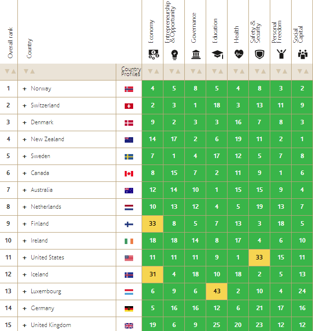 Согласно этому рейтингу самые счастливые люди живут в Норвегии. Хуже всего живется в Центральноафриканской Республике. Больше всего люди довольны своими доходами в Сингапуре. Бизнес проще всего вести в Швеции. Австралийцы более всех довольны качеством образования в своей стране. Качество медицинских услуг – в США. В Гонконге люди ощущают себя наиболее безопасно. Свобода самовыражения выше всего в Канаде. А в Новой Зеландии живут самые отзывчивые люди.
